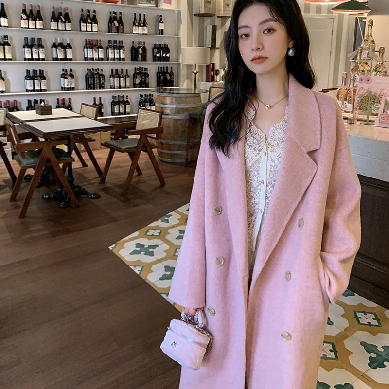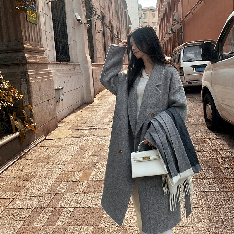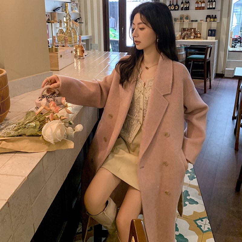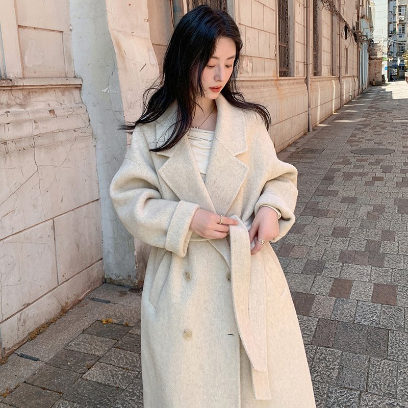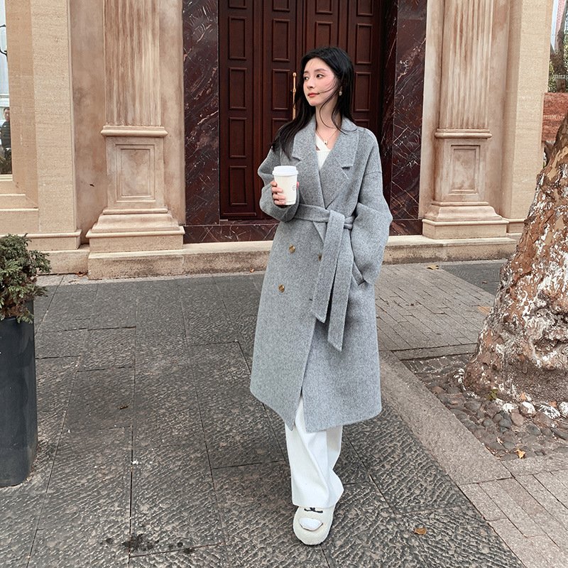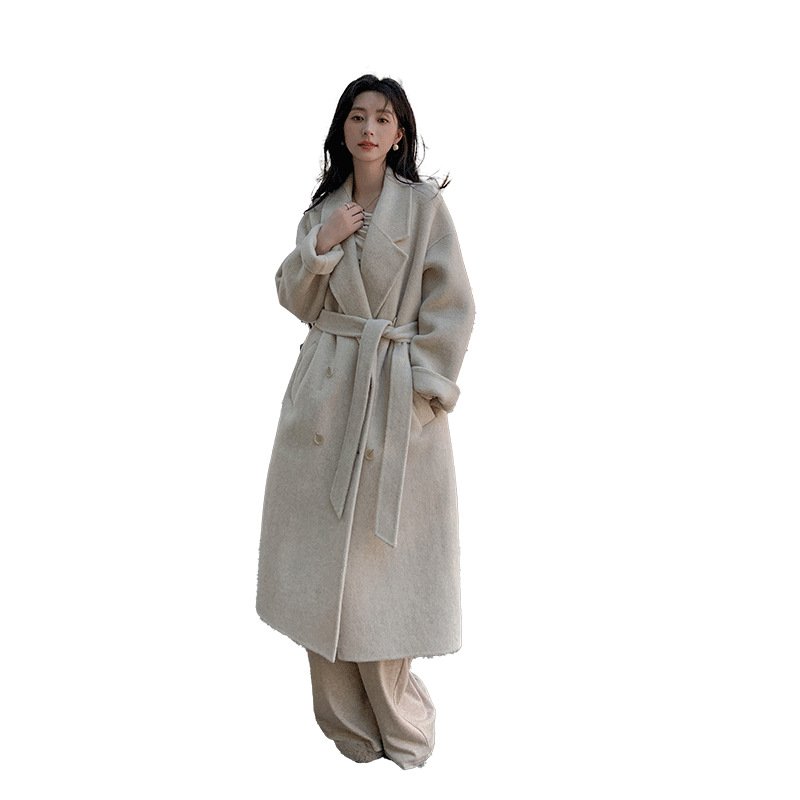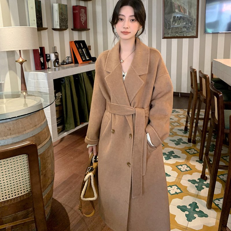 Camel hair temperament double-sided woolen coat women’s long lace-up waist woolen coat commuting style