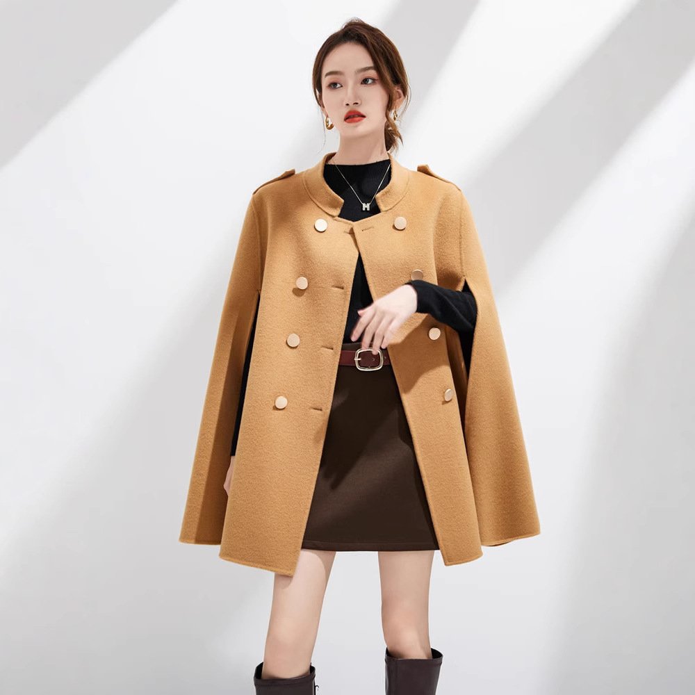 Cape coat women’s season pure wool mid-length cape Hepburn style double-sided cashmere woolen coat for small people