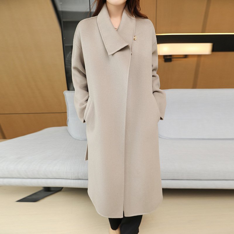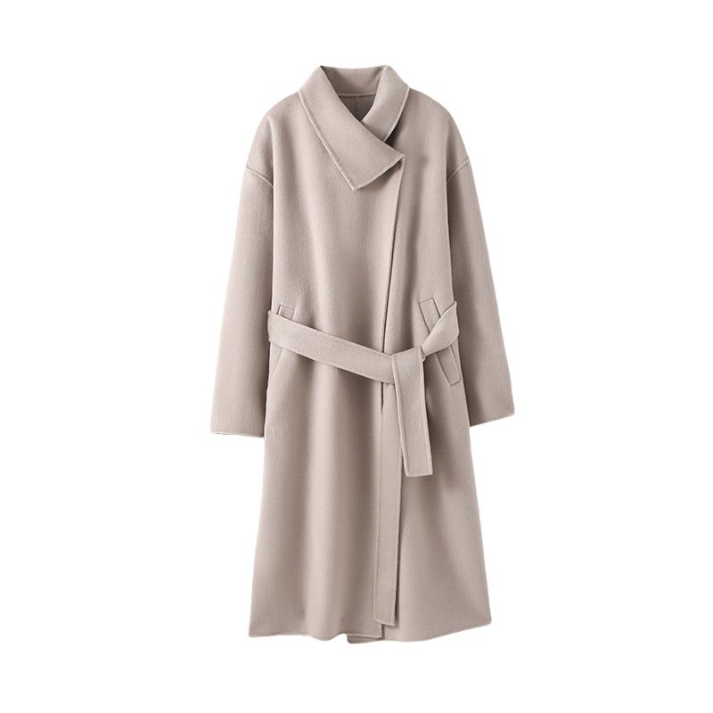 Double-sided woolen coat for women, mid-length lapel, lace-up waist, elegant woolen coat