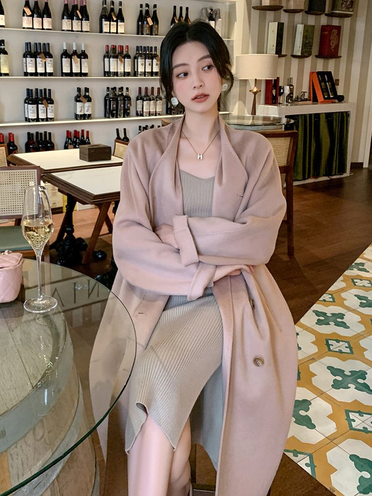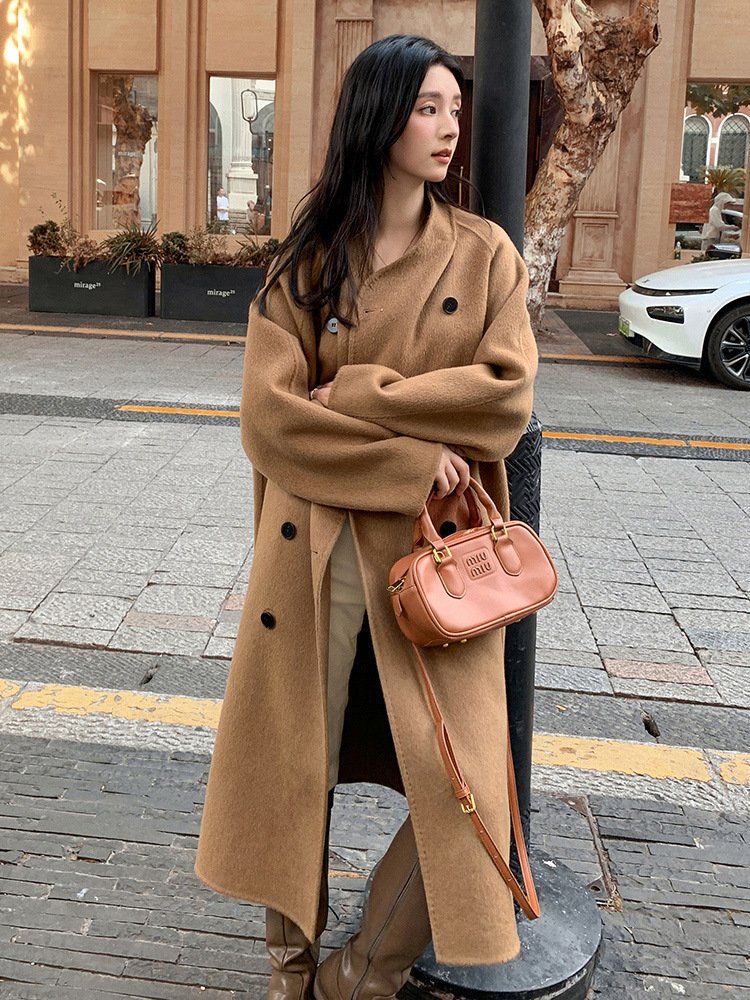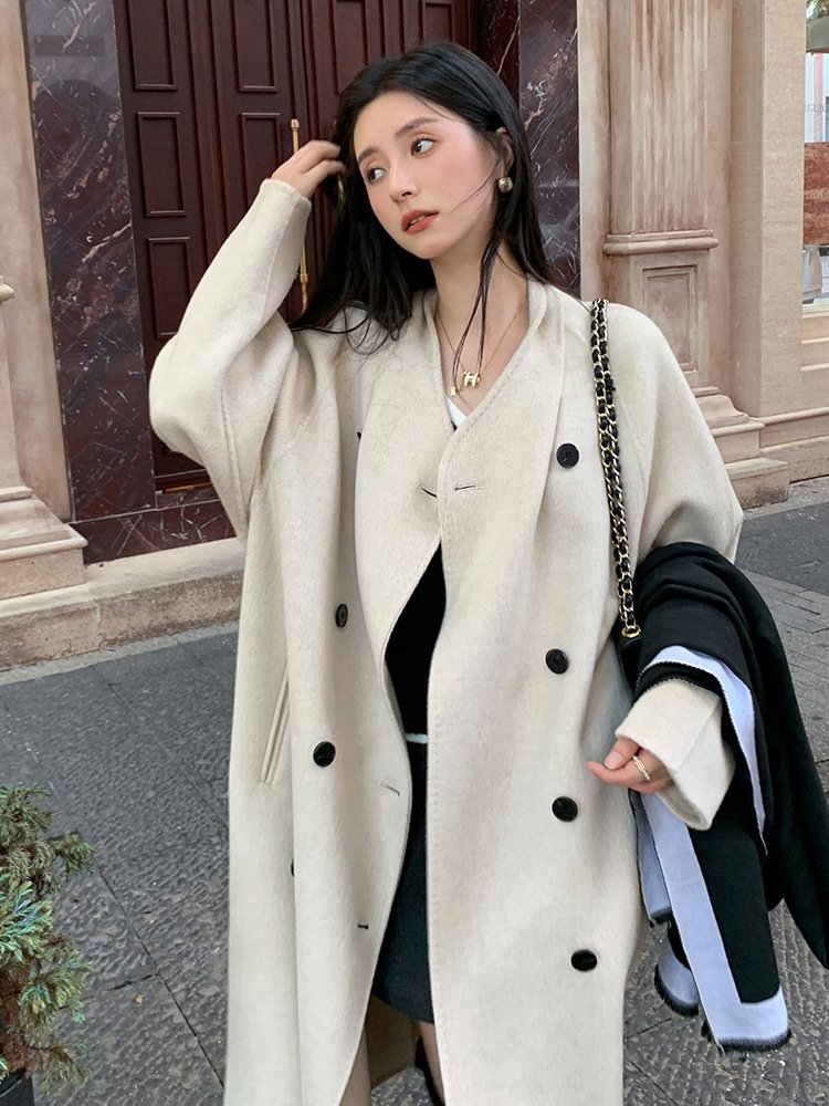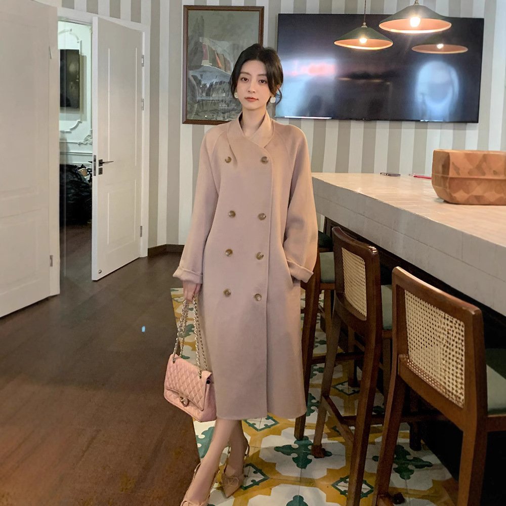 Extra long woolen coat women's lazy wind velvet collarless woolen woolen coat thickened double breasted high-endExtra long woolen coat women’s lazy wind velvet collarless woolen woolen coat thickened double breasted high-end