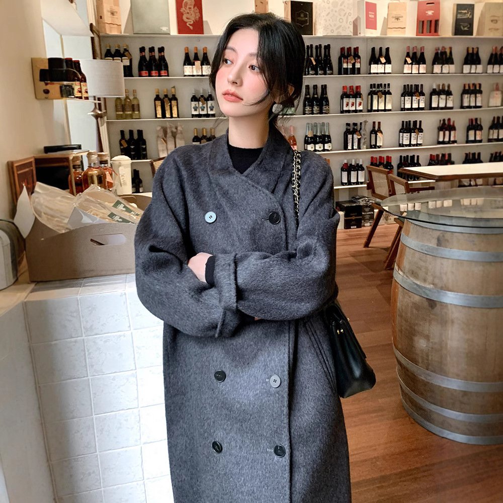 Extra long woolen coat women’s lazy wind velvet collarless woolen woolen coat thickened double breasted high-end