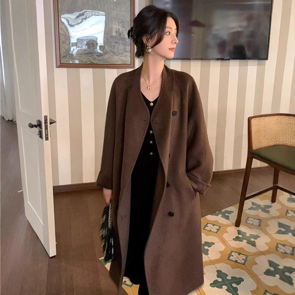 Be the first to review “Extra long woolen coat women’s lazy wind velvet collarless woolen woolen coat thickened double breasted high-end”