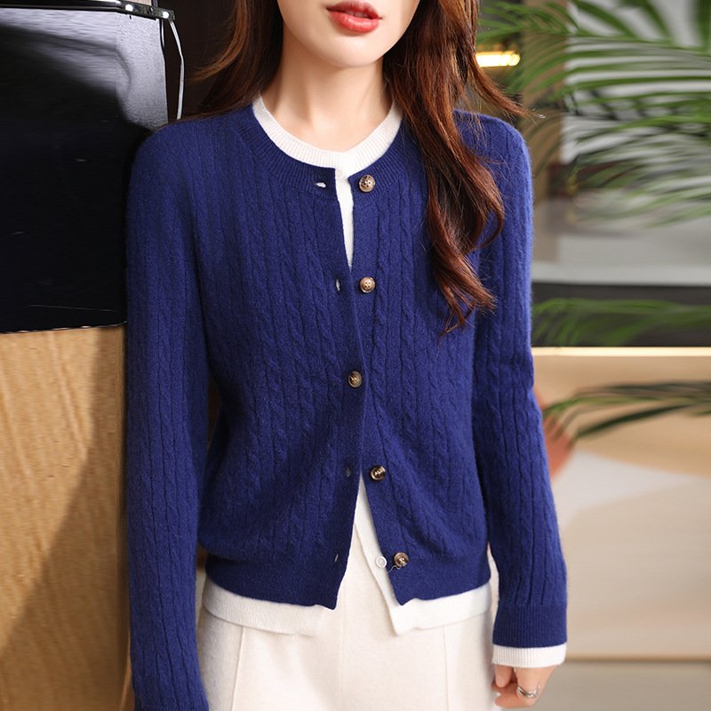 Fashionable women’s fake two-piece wool cardigan solid color casual versatile wool warm and comfortable