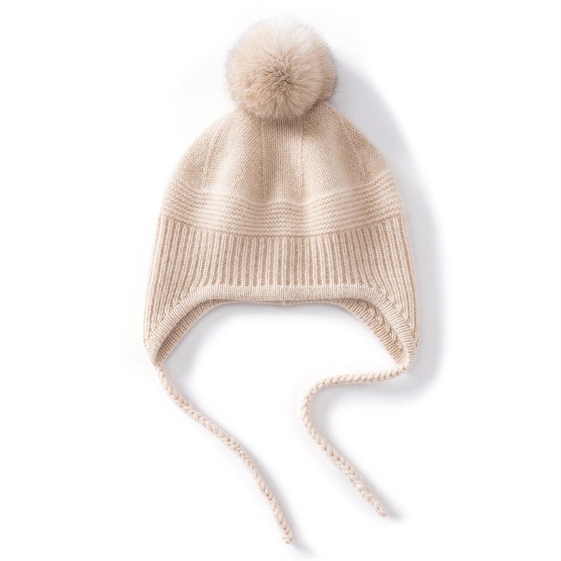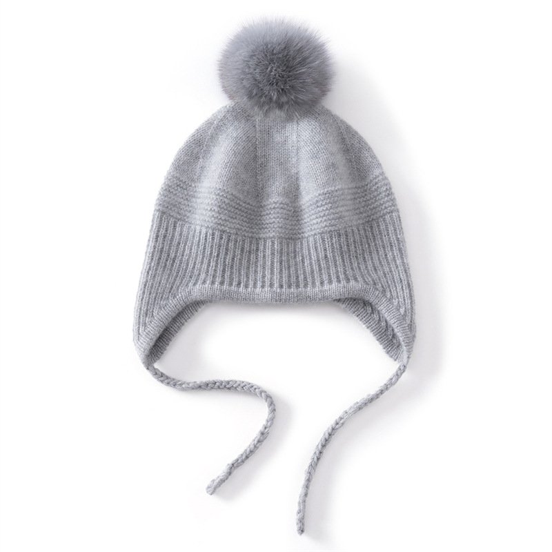 Knitted ear protection hat Women’s fashionable gray warm woolen hat with fox fur ball Versatile and cute