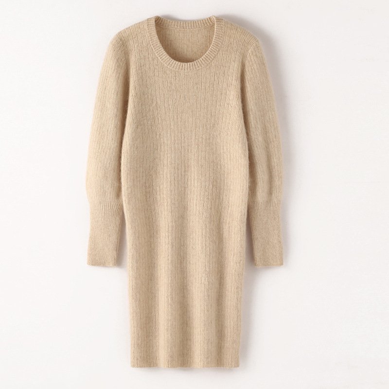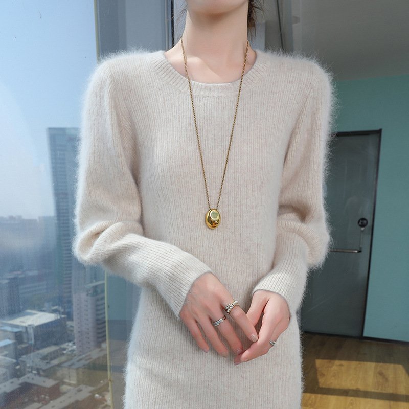 Spring and Autumn mink velvet round neck knitted dress solid color loose warm long sleeve mid-length sweater skirtSpring and Autumn mink velvet round neck knitted dress solid color loose warm long sleeve mid-length sweater skirt