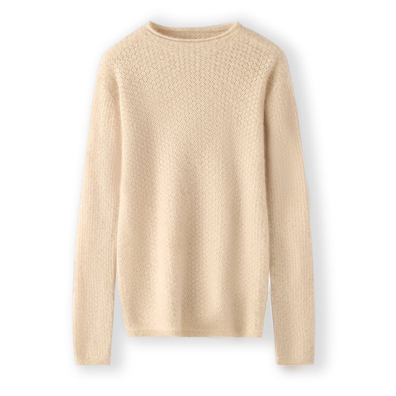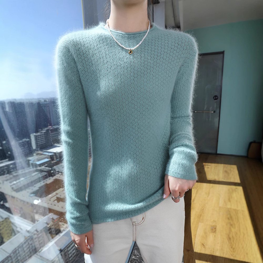 Spring and Autumn mink velvet round neck rolled hem knitted sweater hollow crochet pullover warm base layer sweater