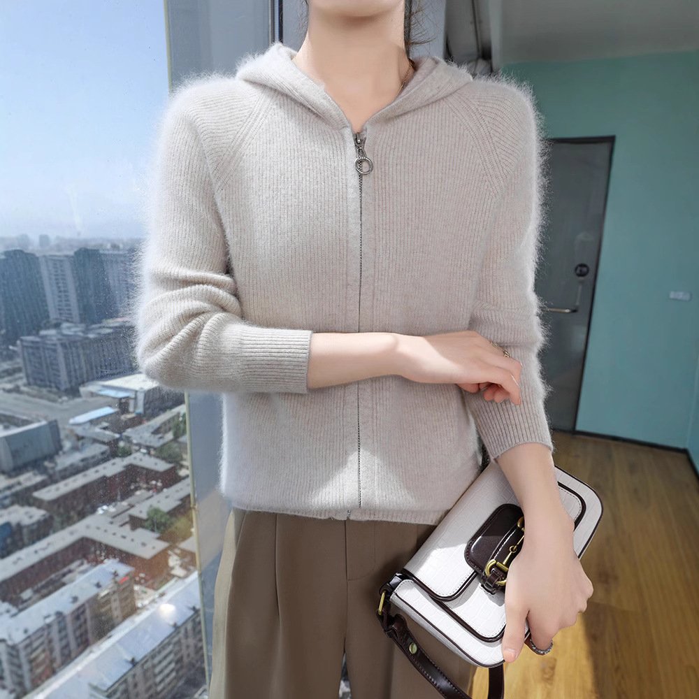 Spring and autumn outer hooded mink sweater for women solid color versatile slim wool knitted zipper cardigan