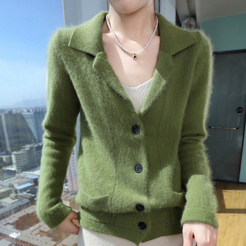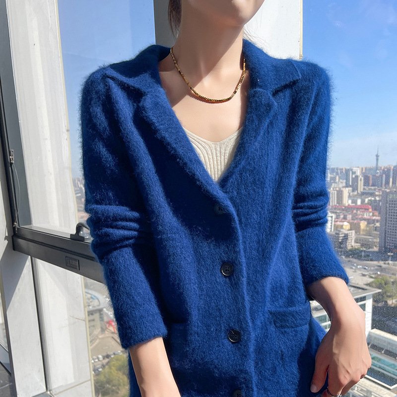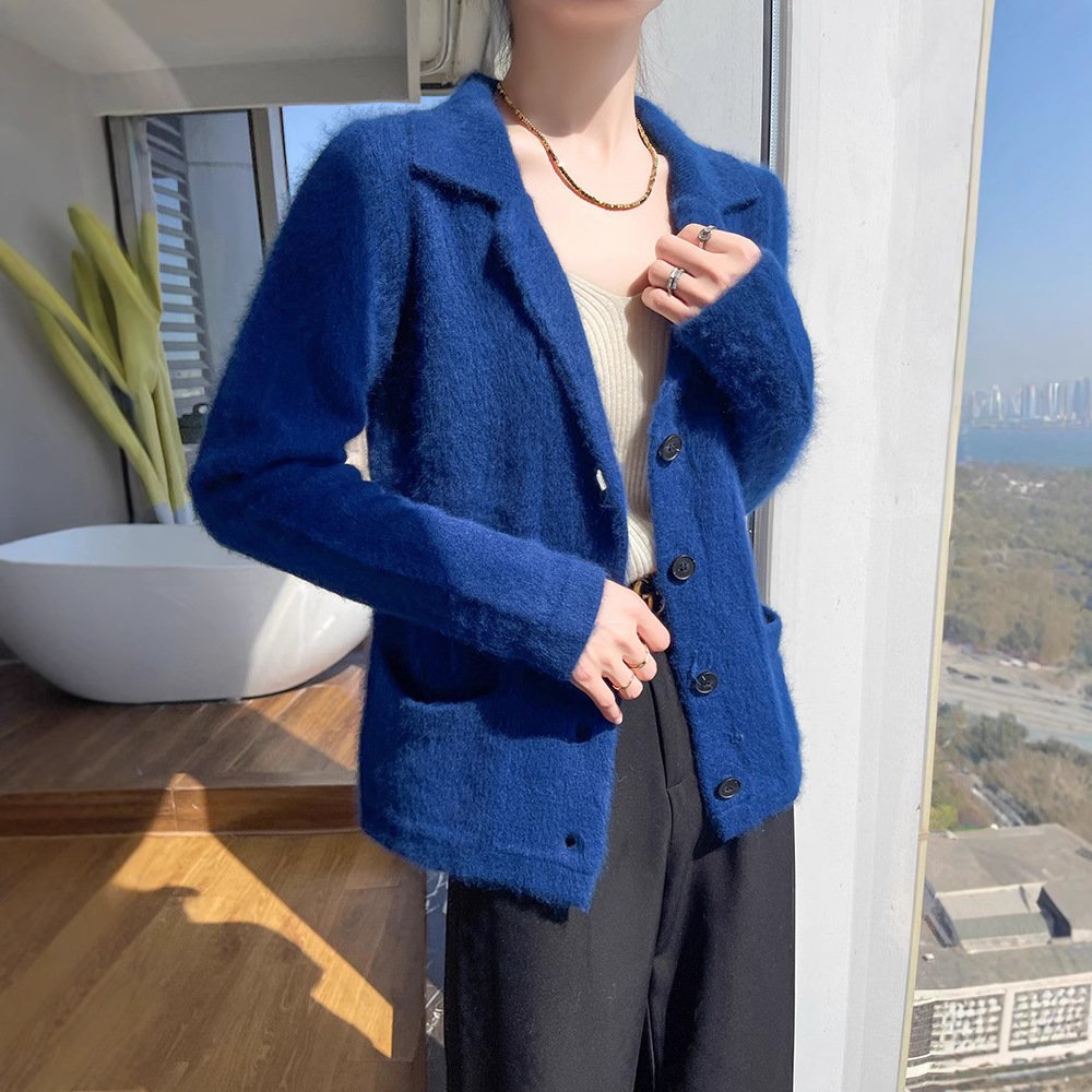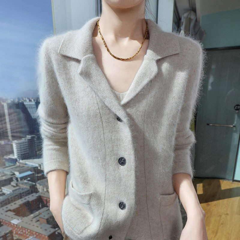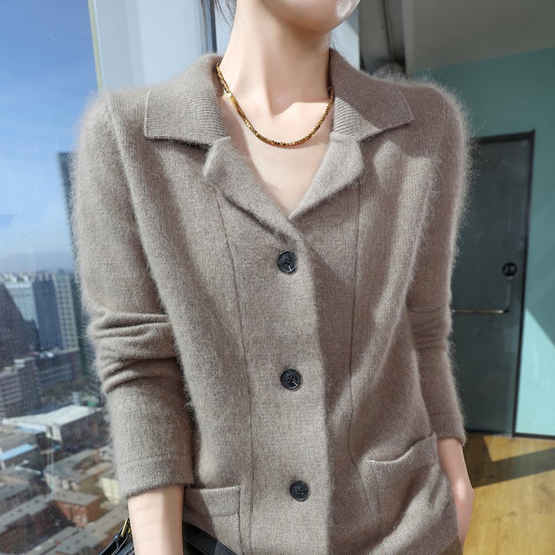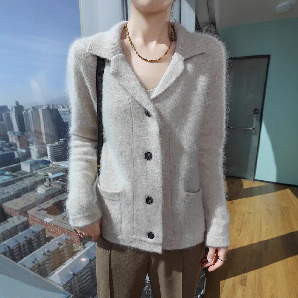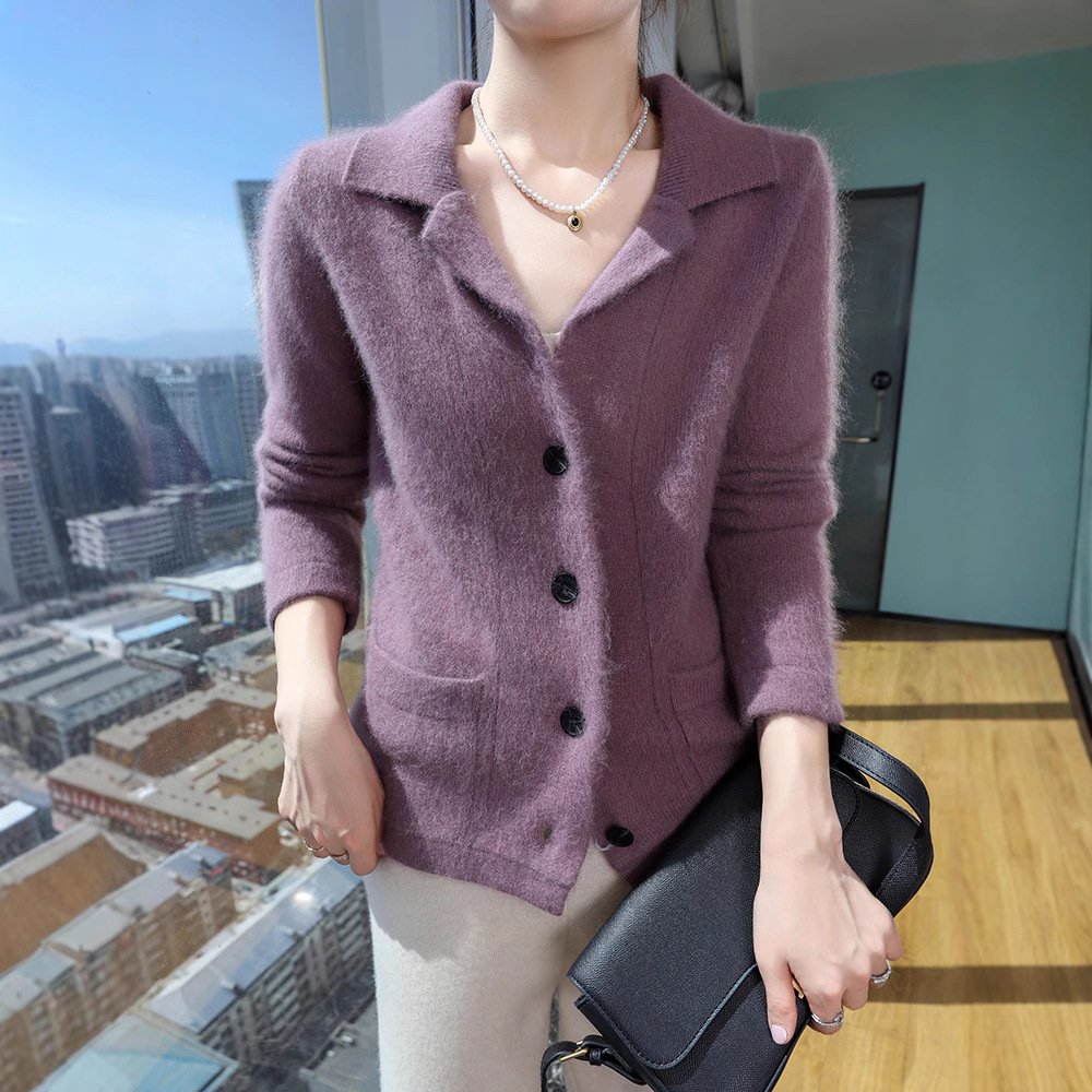 Spring and autumn suit collar knitted mink zipper cardigan jacket for women loose fashionable knitted sweater versatile sweaterSpring and autumn suit collar knitted mink zipper cardigan jacket for women loose fashionable knitted sweater versatile sweater