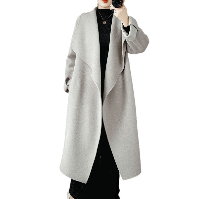 Wool double-faced woolen coat women's extended length over the knee lace-up coat looseWool double-faced woolen coat women’s extended length over the knee lace-up coat loose